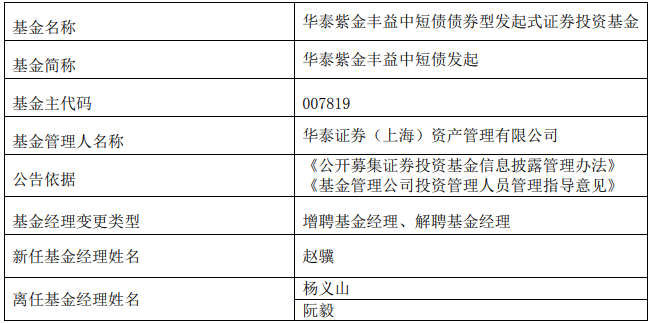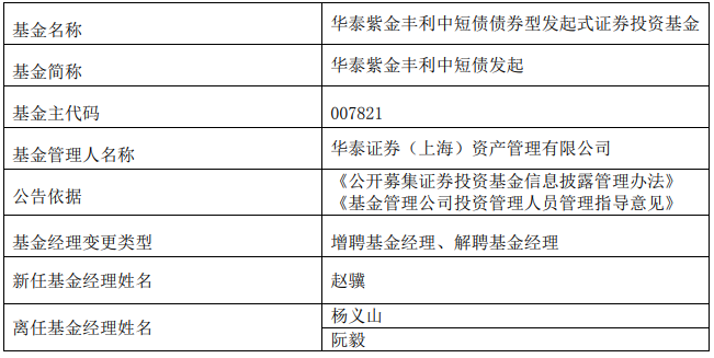 近日,華泰證券(上海)資產(chǎn)管理有限公司公告稱,楊義山、阮毅離任華泰紫金豐利中短債、華泰紫金豐益中短債基金的基金經(jīng)理職務,增聘趙驥管理上述兩只基金。