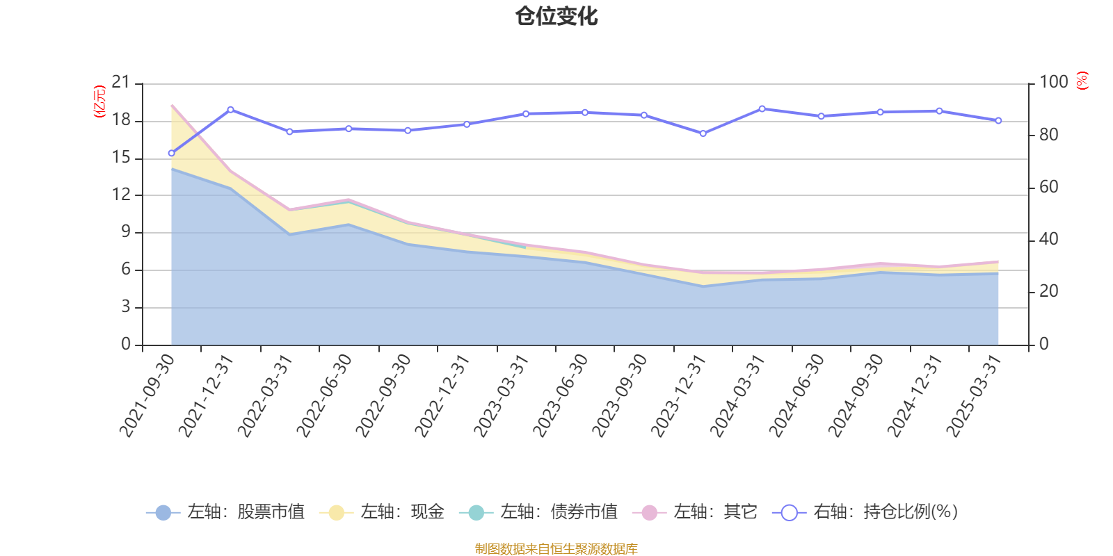 據(jù)定期報告數(shù)據(jù)統(tǒng)計,近三年平均股票倉位為86.43%,同類平均為88.14%。2024年一季度末基金達(dá)到90.31%的最高倉位,2021年三季度末最低,為73.36%。