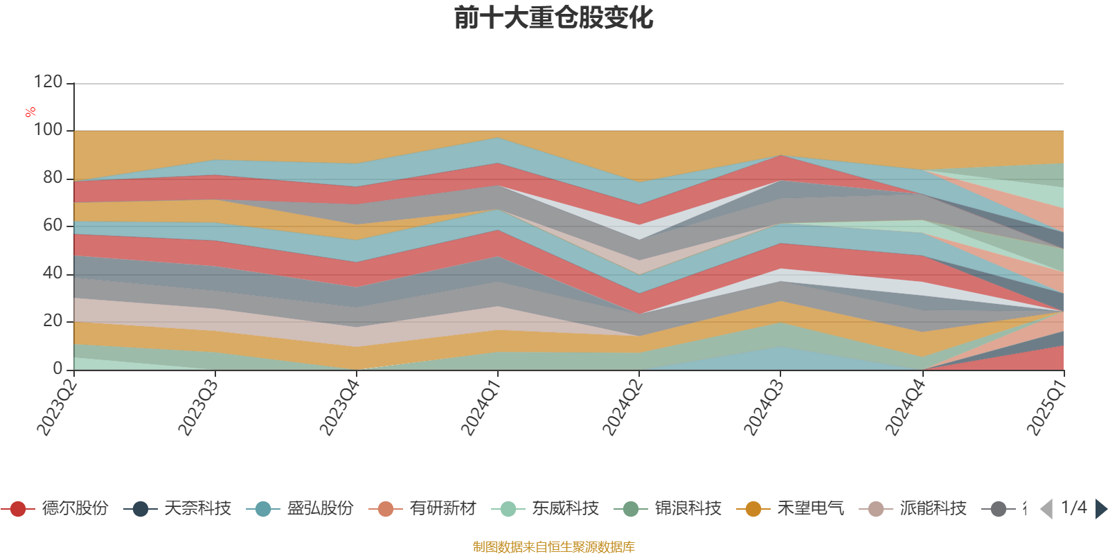 該基金持股集中度較高,近2年前十大重倉股集中度長期超過60%。截至2025年一季度末,基金十大重倉股分別是德爾股份、三祥新材、上海洗霸、瑞泰新材、利元亨、廈鎢新能、有研新材、領(lǐng)湃科技、中科電氣、天奈科技。