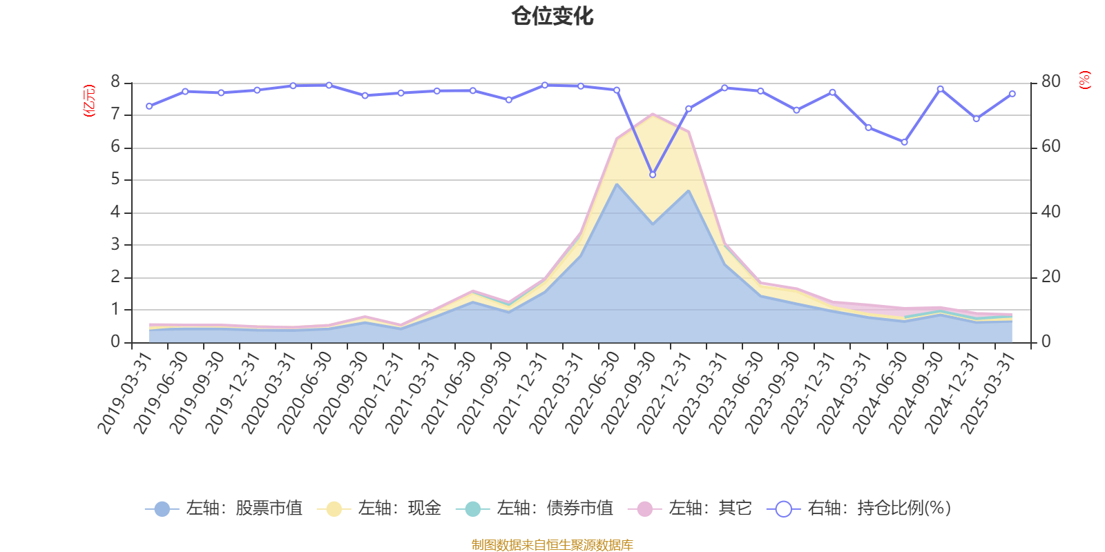 據(jù)定期報告數(shù)據(jù)統(tǒng)計,近三年平均股票倉位為71.47%,同類平均為80.16%。2021年末基金達到79.28%的最高倉位,2022年三季度末最低,為51.69%。