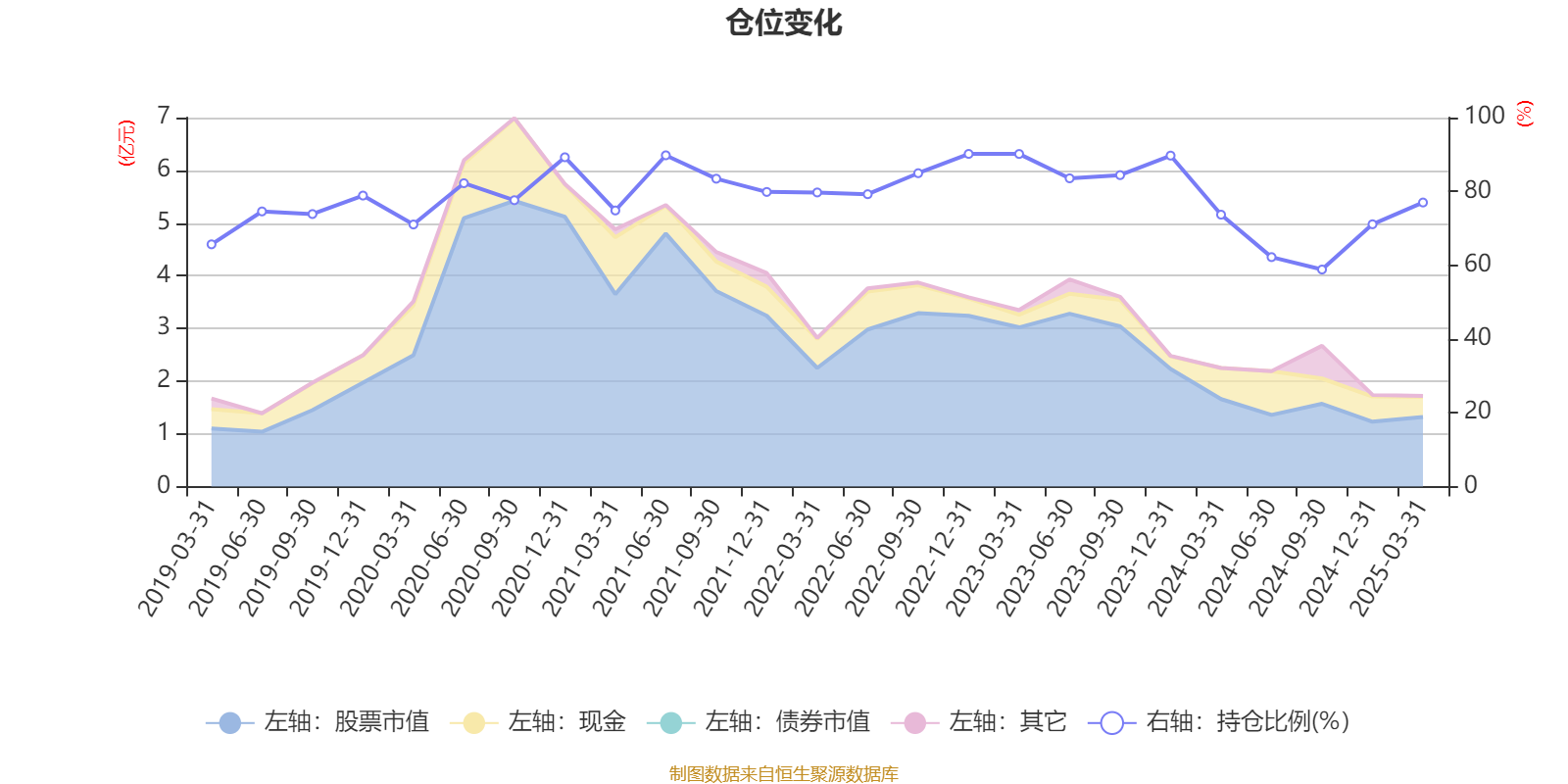 據(jù)定期報(bào)告數(shù)據(jù)統(tǒng)計(jì),近三年平均股票倉位為78.74%,同類平均為85.26%。2022年末基金達(dá)到90.16%的最高倉位,2024年三季度末最低,為58.82%。