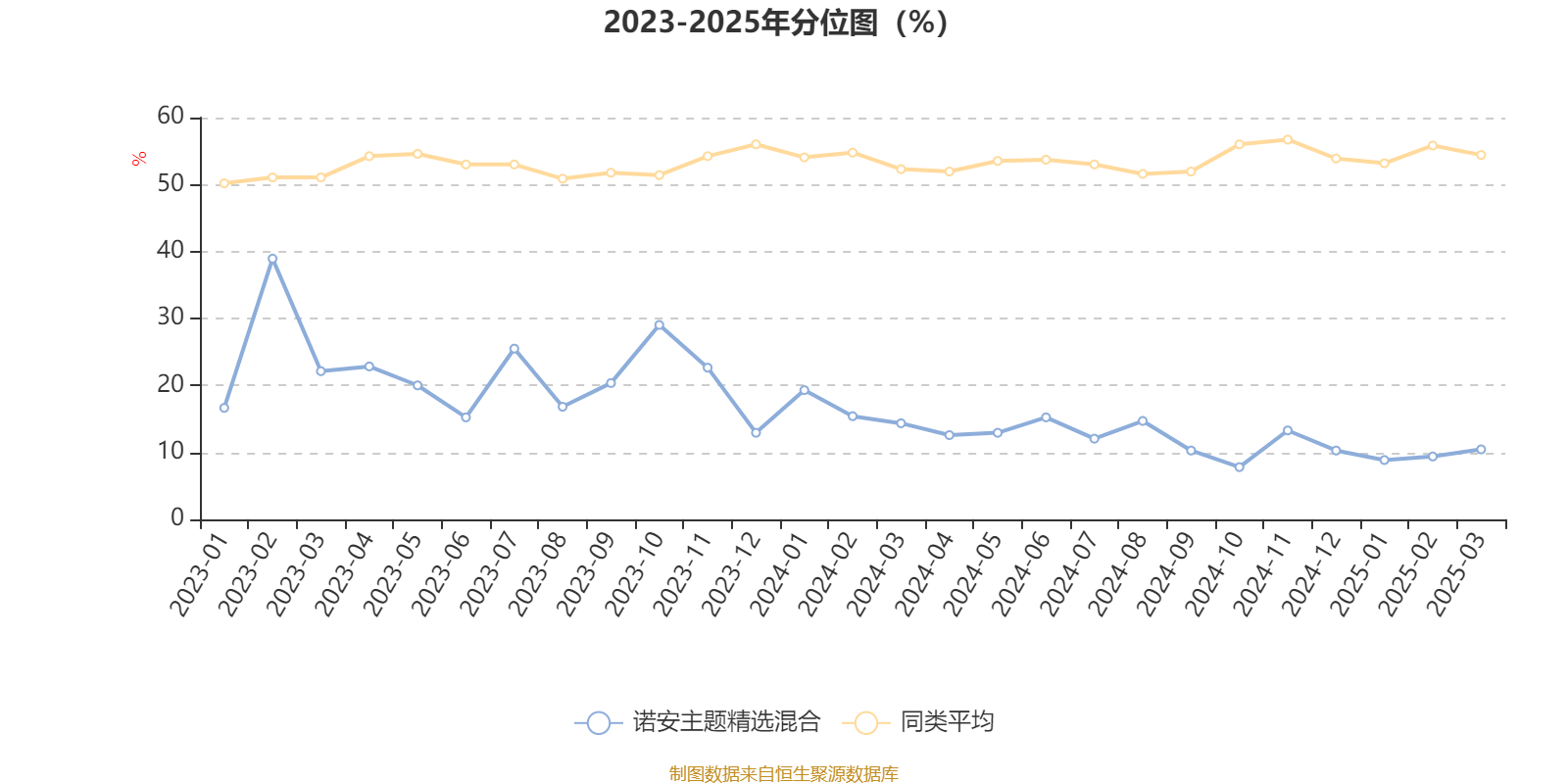 通過所選區(qū)間該基金凈值增長率分位圖,可以觀察該基金與同類基金業(yè)績比較情況。圖為坐標(biāo)原點(diǎn)到區(qū)間內(nèi)某時(shí)點(diǎn)的凈值增長率在同類基金中的分位數(shù)。