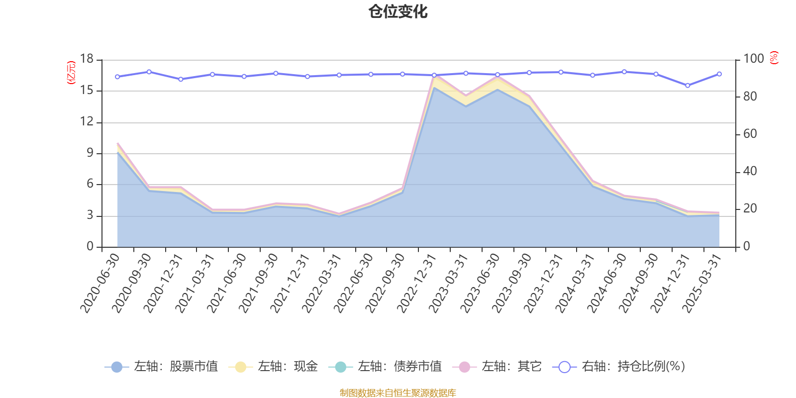 據(jù)定期報告數(shù)據(jù)統(tǒng)計,近三年平均股票倉位為91.98%,同類平均為85.74%。2024年上半年末基金達到93.57%的最高倉位,2024年末最低,為86.25%。