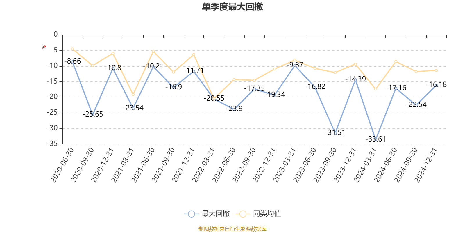 截至4月24日,基金近三年最大回撤為62.6%,同類可比基金排名3/245。單季度最大回撤出現(xiàn)在2024年一季度,為33.61%。