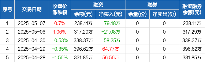 融資方面,當(dāng)日融資買入45.8萬(wàn)元,融資償還124.98萬(wàn)元,融資凈償還79.18萬(wàn)元,連續(xù)3日凈償還累計(jì)158.51萬(wàn)元。融券方面,融券賣出0份,融券償還0份,融券余量0份,融券余額0元。融資融券余額合計(jì)238.11萬(wàn)元。