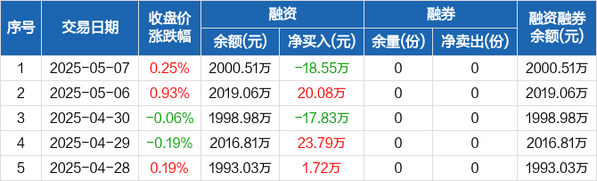 融資方面,當(dāng)日融資買(mǎi)入168.99萬(wàn)元,融資償還187.54萬(wàn)元,融資凈償還18.55萬(wàn)元。融券方面,融券賣(mài)出0份,融券償還0份,融券余量0份,融券余額0元。融資融券余額合計(jì)2000.51萬(wàn)元。