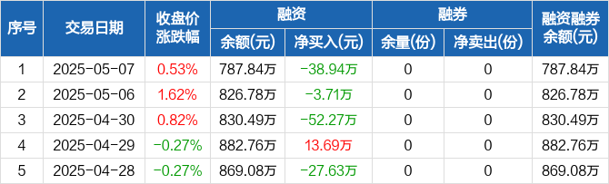 融資方面,當日融資買入151.56萬元,融資償還190.5萬元,融資凈償還38.94萬元,連續(xù)3日凈償還累計94.93萬元。融券方面,融券賣出0份,融券償還0份,融券余量0份,融券余額0元。融資融券余額合計787.84萬元。