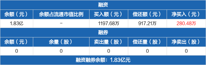 融資方面,當日融資買入1197.68萬元,融資償還917.21萬元,融資凈買入280.48萬元。融券方面,融券賣出0份,融券償還0份,融券余量0份,融券余額0元。融資融券余額合計1.83億元。