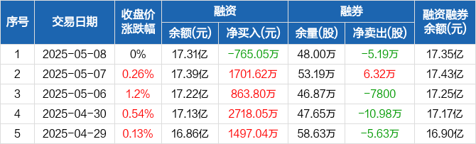 西部證券融資融券信息顯示,2025年5月8日融資凈償還765.05萬元;融資余額17.31億元,較前一日下降0.44%。