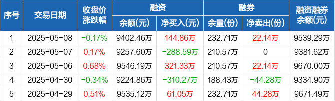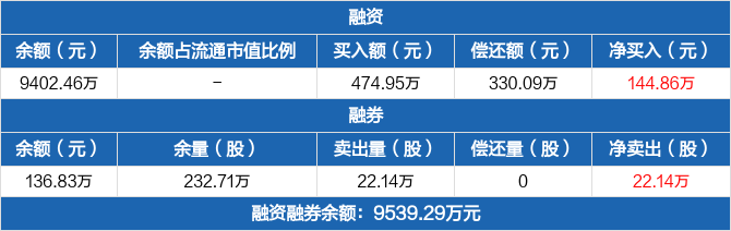 融資方面,當(dāng)日融資買(mǎi)入474.95萬(wàn)元,融資償還330.09萬(wàn)元,融資凈買(mǎi)入144.86萬(wàn)元。融券方面,融券賣(mài)出22.14萬(wàn)份,融券償還0份,融券余量232.71萬(wàn)份,融券余額136.83萬(wàn)元。融資融券余額合計(jì)9539.29萬(wàn)元。