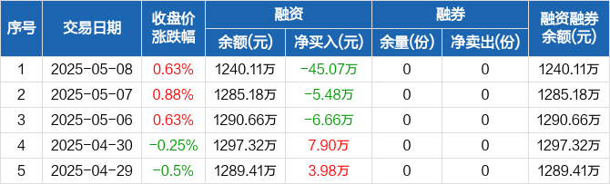 融資方面,當日融資買入19.14萬元,融資償還64.21萬元,融資凈償還45.07萬元,連續(xù)3日凈償還累計57.21萬元。融券方面,融券賣出0份,融券償還0份,融券余量0份,融券余額0元。融資融券余額合計1240.11萬元。