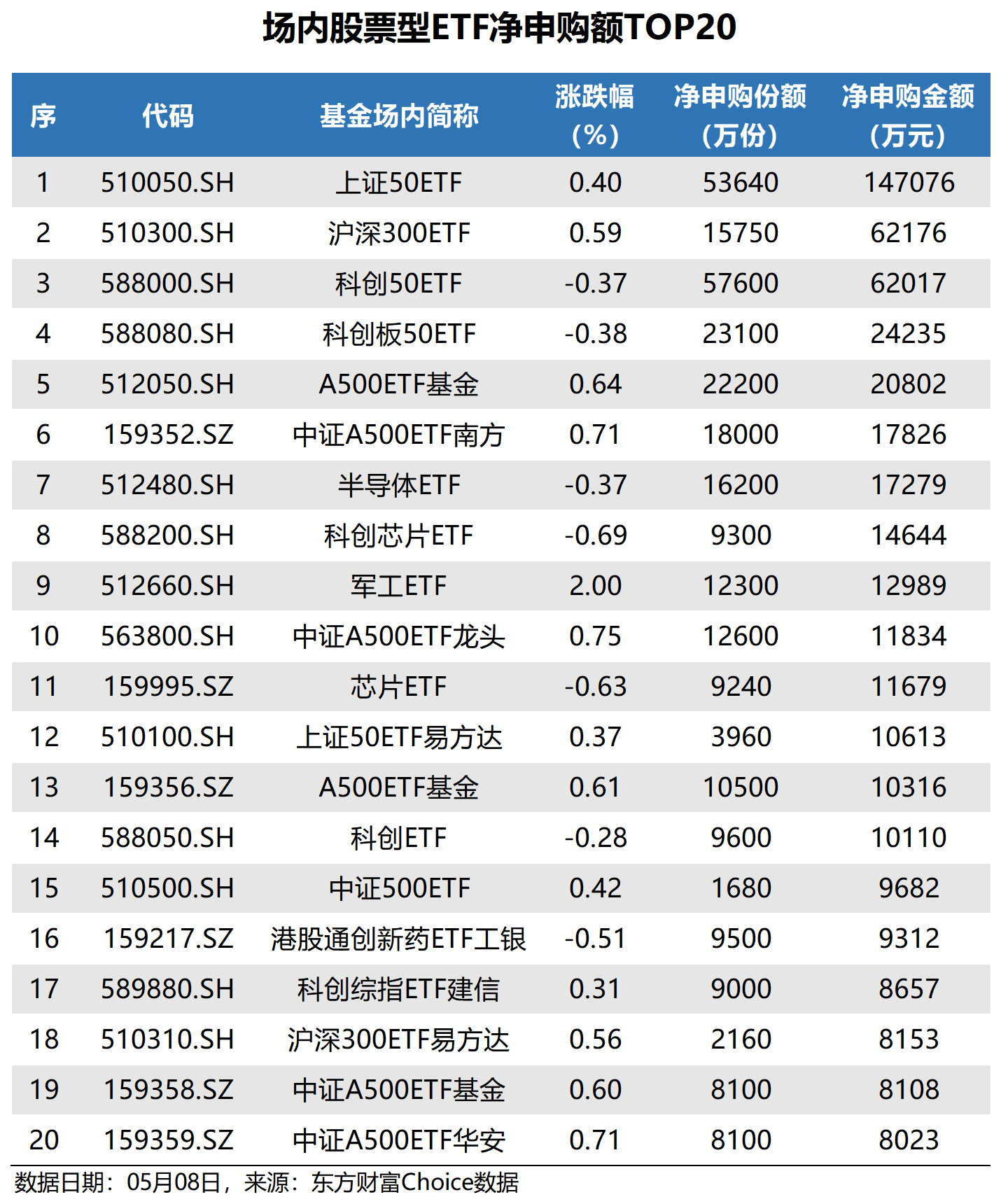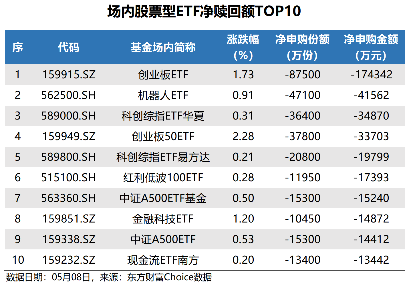 昨日(5月8日),東方財(cái)富Choice數(shù)據(jù)顯示,場內(nèi)股票型ETF凈贖回20.61億份;其中,滬市股票型ETF凈贖回3.78億份,深市股票型ETF凈贖回16.83億份。以最新凈值計(jì),昨日市場凈贖回13.31億元。