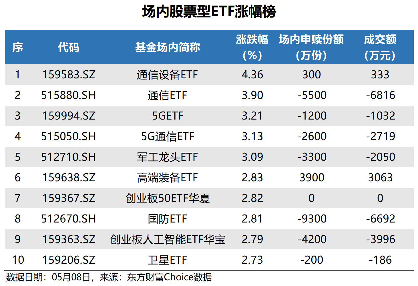 數(shù)據(jù)顯示,昨日場內(nèi)股票型ETF中,通信設(shè)備ETF、通信ETF、5G ETF漲幅居前。其中,通信設(shè)備ETF漲幅最大,達(dá)4.36%。