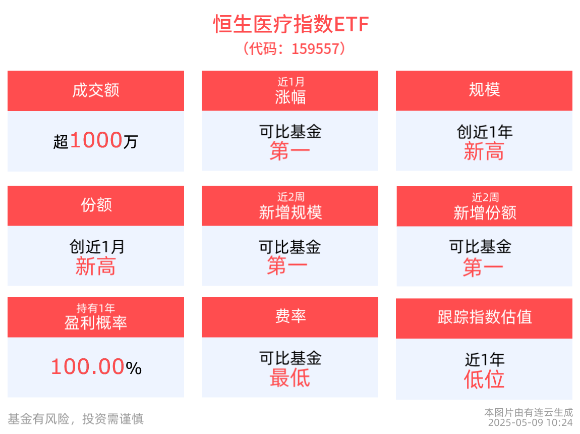 截至2025年5月9日 10:24,恒生醫(yī)療保健指數(shù)上漲0.33%,成分股再鼎醫(yī)藥上漲7.38%,遠大醫(yī)藥上漲3.23%,三生制藥上漲2.94%,巨子生物上漲2.53%,微創(chuàng)機器人-B上漲1.61%。恒生醫(yī)療指數(shù)ETF(159557)上漲0.83%。拉長時間看,截至2025年5月8日,恒生醫(yī)療指數(shù)ETF近1月累計上漲16.06%,漲幅排名可比基金首位。