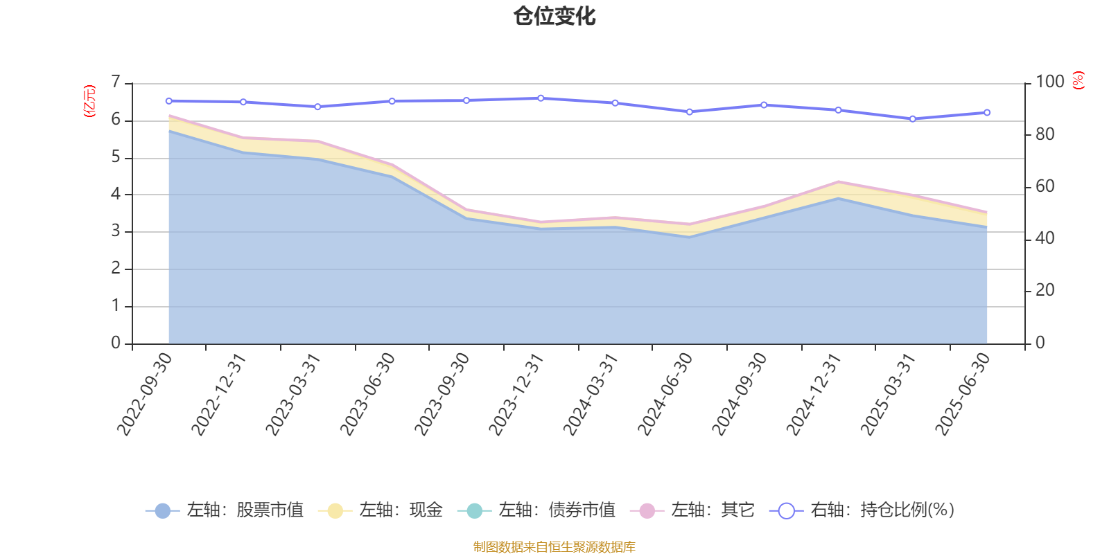 據(jù)定期報(bào)告數(shù)據(jù)統(tǒng)計(jì),近三年平均股票倉位為91.26%,同類平均為85.8%。2023年末基金達(dá)到94.24%的最高倉位,2025年一季度末最低,為86.27%。