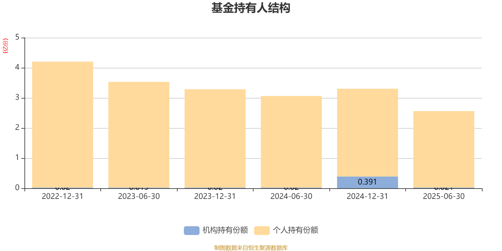 截至2025年6月30日,基金持有人共計(jì)2.19萬戶,合計(jì)持有2.56億份。其中管理人員工持有25.72萬份,占比0.10%,機(jī)構(gòu)持有份額占比0.84%,個(gè)人投資者占比99.16%。