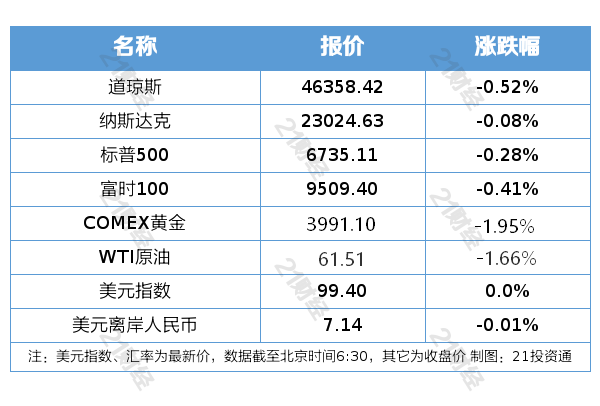 紐約股市三大股指10月9日下跌。截至當(dāng)天收盤,道瓊斯工業(yè)平均指數(shù)比前一交易日下跌243.36點,收于46358.42點,跌幅為0.52%;標(biāo)準(zhǔn)普爾500種股票指數(shù)下跌18.61點,收于6735.11點,跌幅為0.28%;納斯達克綜合指數(shù)下跌18.75點,收于23024.63點,跌幅為0.08%。