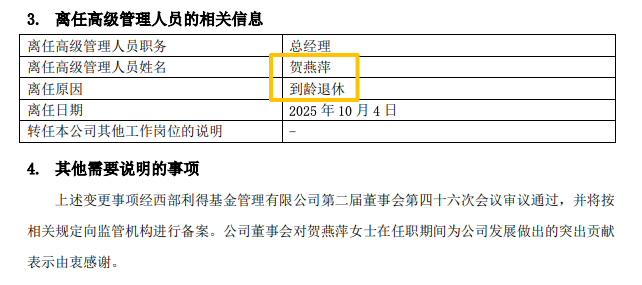 10月10日,西部利得基金公告稱,賀燕萍因到齡退休,已于2025年10月4日離任總經(jīng)理一職,由董事長何方代任總經(jīng)理。