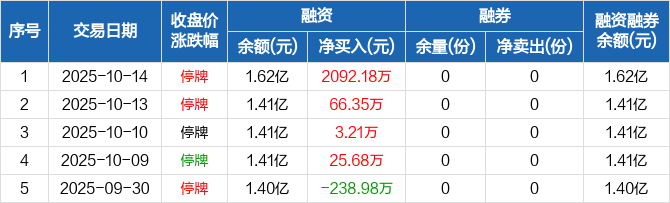 融資方面,當(dāng)日融資買入2326.1萬元,融資償還233.92萬元,融資凈買入2092.18萬元,連續(xù)4日凈買入累計2187.41萬元。融券方面,融券賣出0份,融券償還0份,融券余量0份,融券余額0元。融資融券余額合計1.62億元。