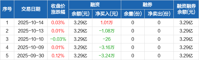 融資方面,當(dāng)日融資買入3.25萬元,融資償還2.24萬元,融資凈買入1.01萬元。融券方面,融券賣出0份,融券償還0份,融券余量0份,融券余額0元。融資融券余額合計(jì)3.29億元。