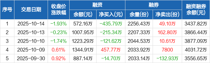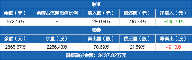融資方面,當(dāng)日融資買入280.94萬元,融資償還716.73萬元,融資凈償還435.79萬元,連續(xù)3日凈償還累計(jì)772.75萬元。融券方面,融券賣出70.69萬份,融券償還21.59萬份,融券余量2256.43萬份,融券余額2865.67萬元。融資融券余額合計(jì)3437.82萬元。