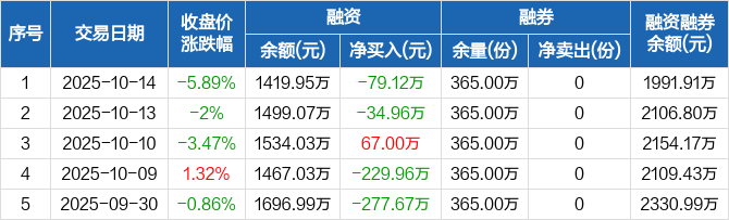 5GETF融資融券信息顯示,2025年10月14日融資凈償還79.12萬(wàn)元;融資余額1419.95萬(wàn)元,較前一日下降5.28%。