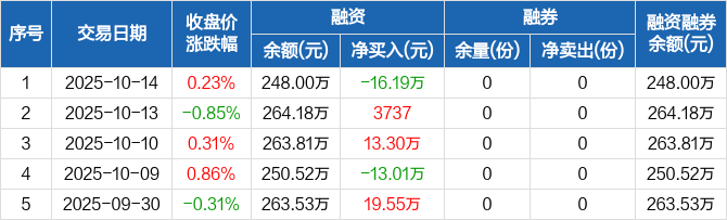 融資方面,當(dāng)日融資買入146.06萬元,融資償還162.25萬元,融資凈償還16.19萬元。融券方面,融券賣出0份,融券償還0份,融券余量0份,融券余額0元。融資融券余額合計(jì)248萬元。