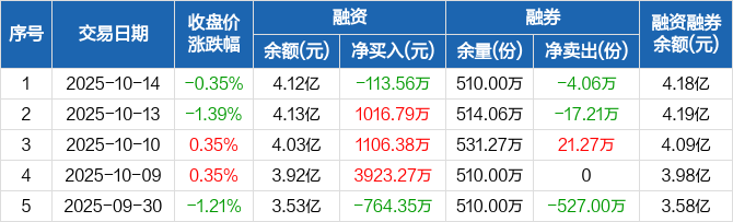 融資方面,當(dāng)日融資買入4400.43萬元,融資償還4513.99萬元,融資凈償還113.56萬元。融券方面,融券賣出0份,融券償還4.06萬份,融券余量510萬份,融券余額577.83萬元。融資融券余額合計4.18億元。