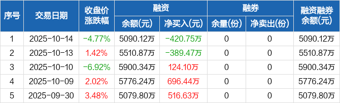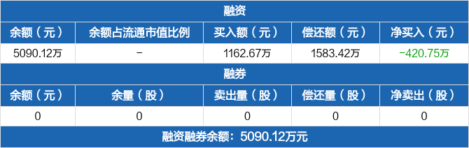 融資方面,當(dāng)日融資買入1162.67萬(wàn)元,融資償還1583.42萬(wàn)元,融資凈償還420.75萬(wàn)元。融券方面,融券賣出0份,融券償還0份,融券余量0份,融券余額0元。融資融券余額合計(jì)5090.12萬(wàn)元。