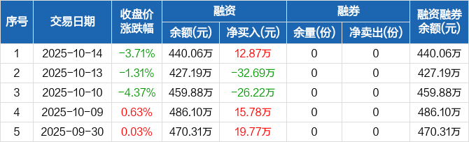 融資方面,當(dāng)日融資買(mǎi)入98.5萬(wàn)元,融資償還85.63萬(wàn)元,融資凈買(mǎi)入12.87萬(wàn)元。融券方面,融券賣(mài)出0份,融券償還0份,融券余量0份,融券余額0元。融資融券余額合計(jì)440.06萬(wàn)元。