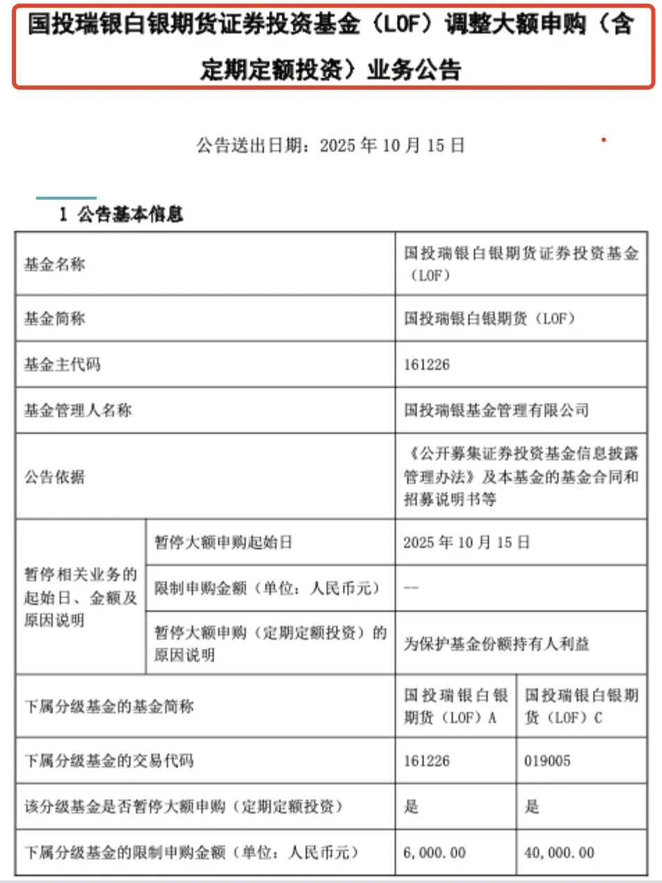 同日,國投瑞銀基金也發(fā)布公告稱,為保護(hù)基金份額持有人利益,自2025年10月15日起,限制國投白銀A類、C類基金份額的定期定額投資金額分別為6000元及40000元。