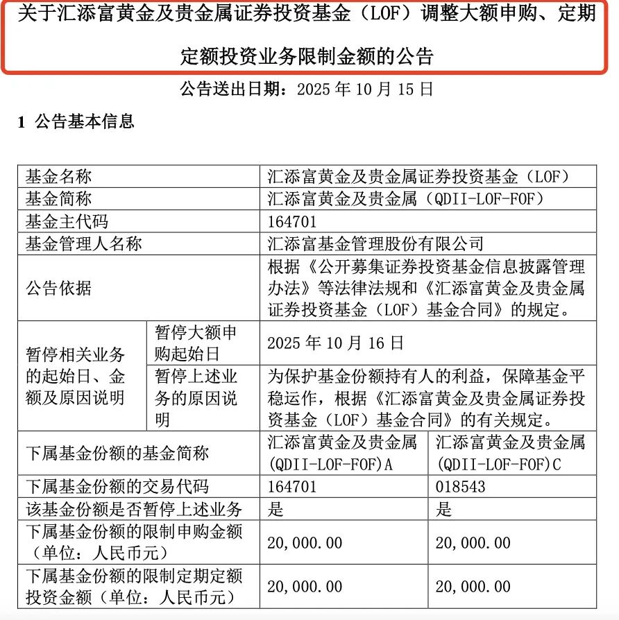 就在上月,匯添富基金剛剛公告,自2025年9月2日起匯添富黃金及貴金屬(QDII-LOF-FOF)A、C份額限制大額申購、大額定期定額投資業(yè)務(wù),限制金額為50000元。