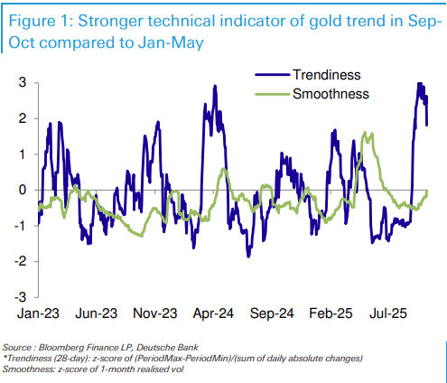最后,從技術(shù)指標來看,德意志銀行團隊認為,9月至10月期間可能已出現(xiàn)"趨勢性見頂"的跡象——他們的模型顯示,金價偏離趨勢的時間遠超歷史平均水平。