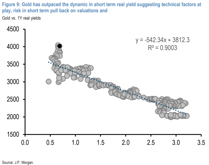 摩根大通指出,黃金近期的飆升已遠超通常由一年期實際利率下降所能解釋的漲幅。理論上,當其他"安全資產(chǎn)"的實際回報率下降時,黃金就變得更具吸引力。