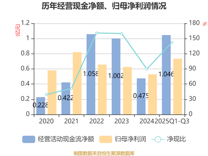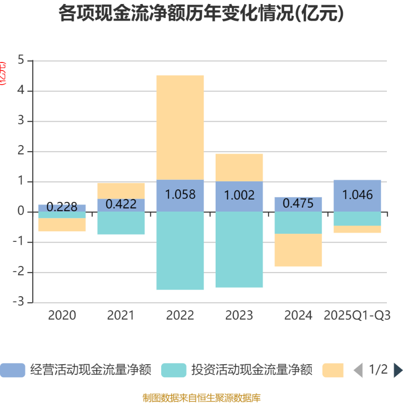 2025年前三季度,公司經(jīng)營活動現(xiàn)金流凈額為1.05億元,同比增長147.55%;籌資活動現(xiàn)金流凈額-2358.81萬元,同比增加8325.52萬元;投資活動現(xiàn)金流凈額-4680.33萬元,上年同期為-4689.61萬元。
