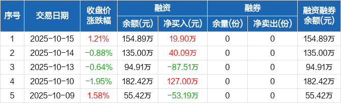 融資方面,當日融資買入170.55萬元,融資償還150.66萬元,融資凈買入19.9萬元。融券方面,融券賣出0份,融券償還0份,融券余量0份,融券余額0元。融資融券余額合計154.89萬元。