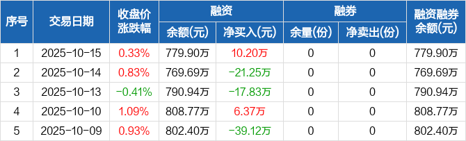 融資方面,當日融資買入14.55萬元,融資償還4.35萬元,融資凈買入10.2萬元。融券方面,融券賣出0份,融券償還0份,融券余量0份,融券余額0元。融資融券余額合計779.9萬元。