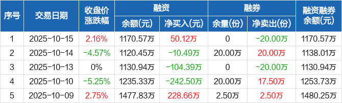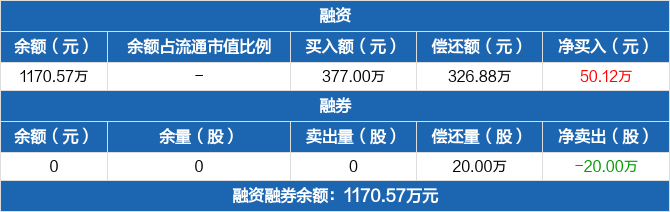 融資方面,當(dāng)日融資買入377萬(wàn)元,融資償還326.88萬(wàn)元,融資凈買入50.12萬(wàn)元。融券方面,融券賣出0份,融券償還20萬(wàn)份,融券余量0份,融券余額0元。融資融券余額合計(jì)1170.57萬(wàn)元。