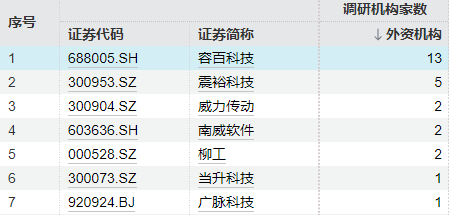 Wind數(shù)據(jù)顯示,10月以來,接受外資機構(gòu)調(diào)研的行業(yè)主要集中在科技領(lǐng)域,其中容百科技獲得13家外資機構(gòu)調(diào)研。此外,外資機構(gòu)近期還調(diào)研了當(dāng)升科技、威力傳動、廣脈科技、南威軟件等科技公司。