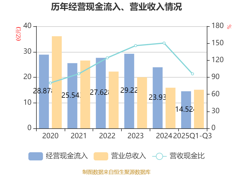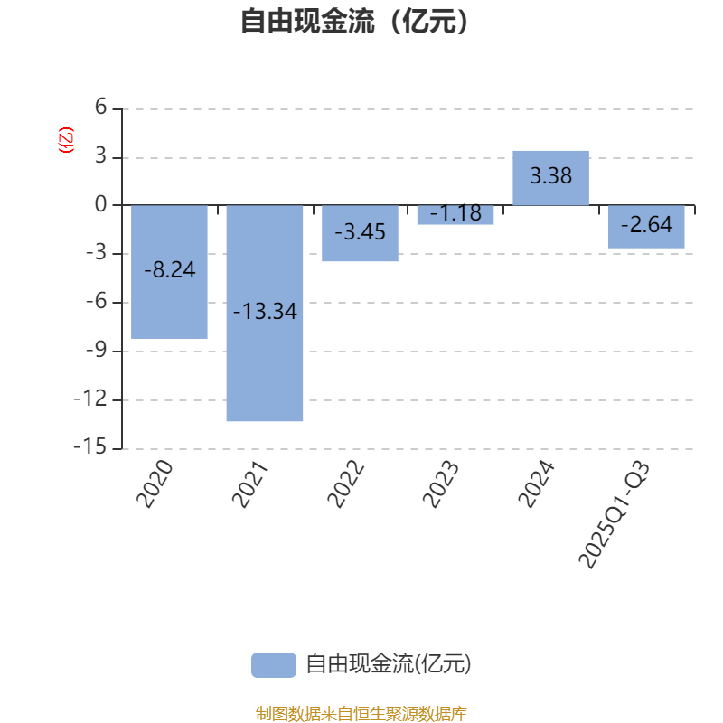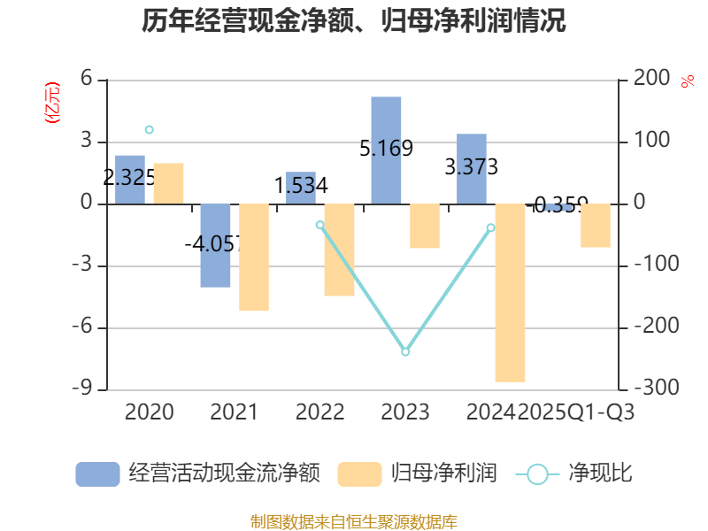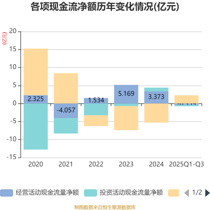 2025年前三季度,公司經(jīng)營活動(dòng)現(xiàn)金流凈額為-3586.19萬元,同比減少1.99億元;籌資活動(dòng)現(xiàn)金流凈額2.27億元,同比增加5.76億元;投資活動(dòng)現(xiàn)金流凈額-3997萬元,上年同期為9821.27萬元。
