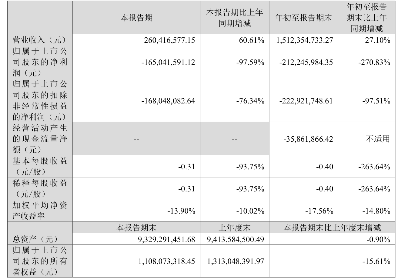 中證智能財(cái)訊博世科(300422)10月17日披露2025年第三季度報(bào)告。前三季度公司實(shí)現(xiàn)營業(yè)總收入15.12億元,同比增長27.10%;歸母凈利潤虧損2.12億元,上年同期虧損5723.48萬元;扣非凈利潤虧損2.23億元,上年同期虧損1.13億元;經(jīng)營活動(dòng)產(chǎn)生的現(xiàn)金流量凈額為-3586.19萬元,上年同期為1.63億元;報(bào)告期內(nèi),博世科基本每股收益為-0.4元,加權(quán)平均凈資產(chǎn)收益率為-17.56%。