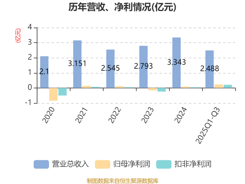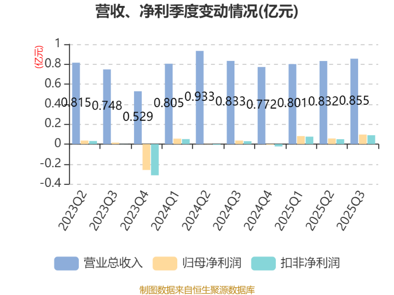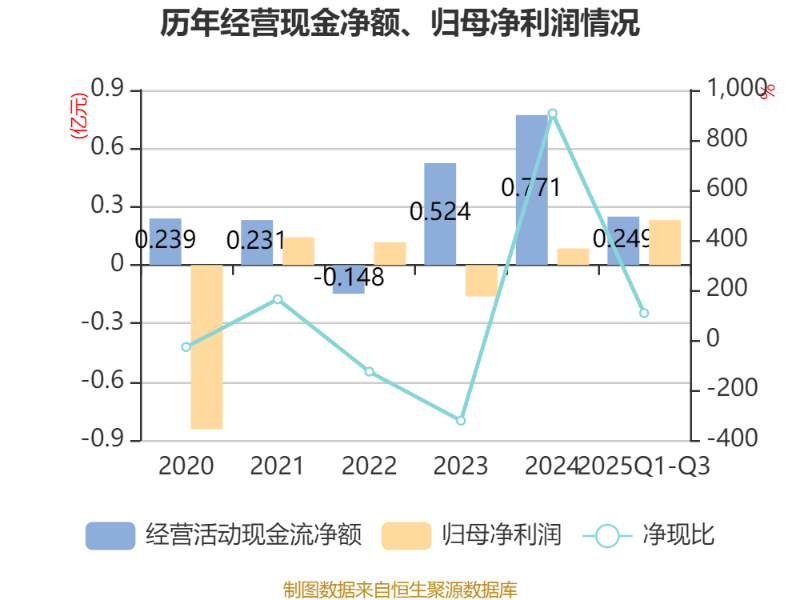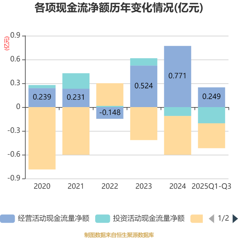2025年前三季度,公司經營活動現金流凈額為2485.42萬元,同比下降45.26%;籌資活動現金流凈額-3140.58萬元,同比減少826.48萬元;投資活動現金流凈額-2044.28萬元,上年同期為19.63萬元。