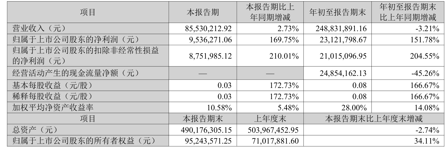 中證智能財訊華東數控(002248)10月17日披露2025年第三季度報告。前三季度公司實現營業(yè)總收入2.49億元,同比下降3.21%;歸母凈利潤2312.18萬元,同比增長151.78%;扣非凈利潤2101.51萬元,同比增長204.55%;經營活動產生的現金流量凈額為2485.42萬元,同比下降45.26%;報告期內,華東數控基本每股收益為0.08元,加權平均凈資產收益率為28.00%。
