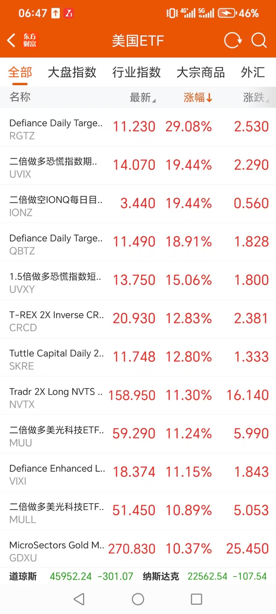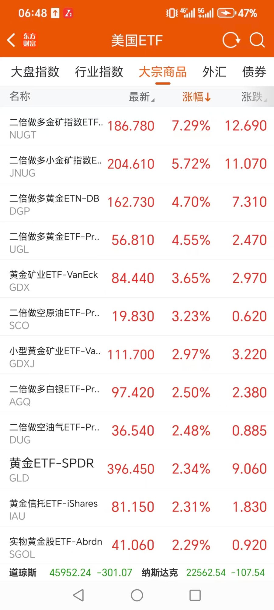 $2倍做多黃金ETF-ProShares (UGL.US)$ 升4.55%,成交額3.53億美元。