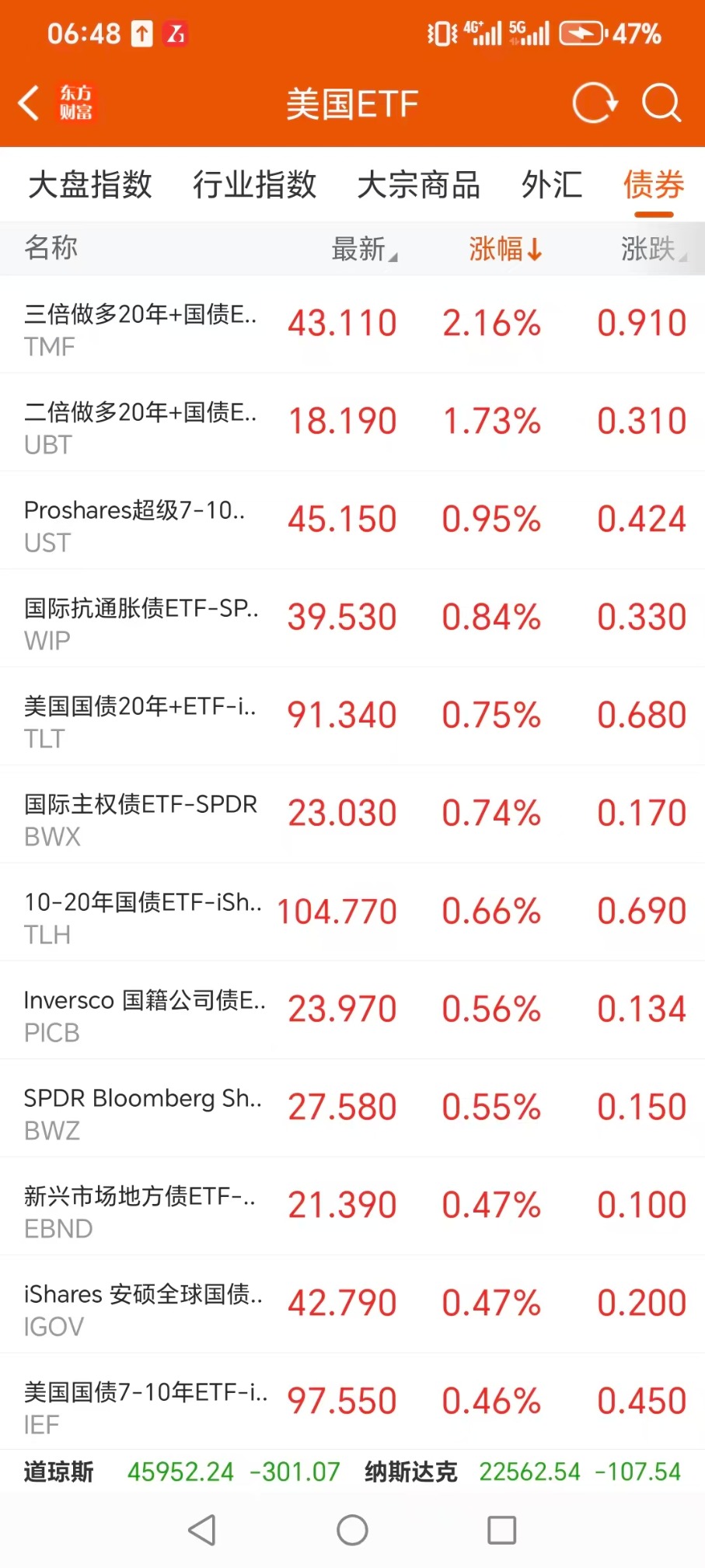 $三倍做多20年期以上國債ETF-Direxion (TMF.US)$ 升2.16%,成交額2.44億美元。