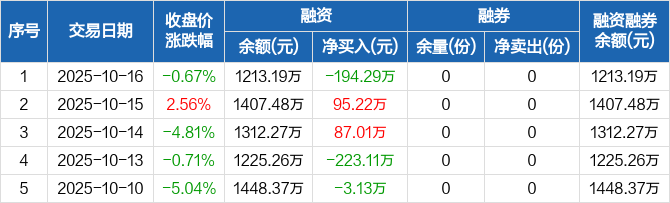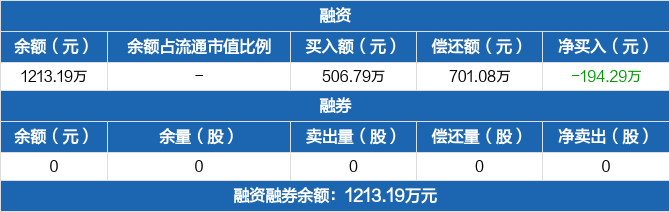 融資方面,當(dāng)日融資買入506.79萬元,融資償還701.08萬元,融資凈償還194.29萬元。融券方面,融券賣出0份,融券償還0份,融券余量0份,融券余額0元。融資融券余額合計1213.19萬元。