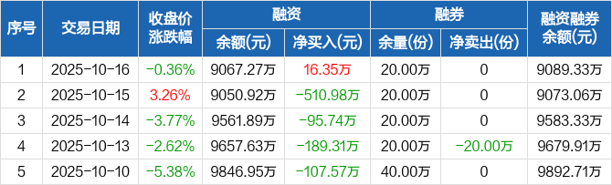 融資方面,當(dāng)日融資買入1491.81萬元,融資償還1475.46萬元,融資凈買入16.35萬元。融券方面,融券賣出0份,融券償還0份,融券余量20萬份,融券余額22.06萬元。融資融券余額合計9089.33萬元。