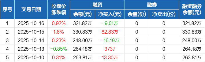 融資方面,當(dāng)日融資買入73.82萬元,融資償還82.83萬元,融資凈償還9.01萬元。融券方面,融券賣出0份,融券償還0份,融券余量0份,融券余額0元。融資融券余額合計321.82萬元。