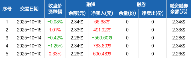 融資方面,當(dāng)日融資買(mǎi)入2710.82萬(wàn)元,融資償還2644.14萬(wàn)元,融資凈買(mǎi)入66.68萬(wàn)元。融券方面,融券賣(mài)出0份,融券償還0份,融券余量0份,融券余額0元。融資融券余額合計(jì)2.34億元。