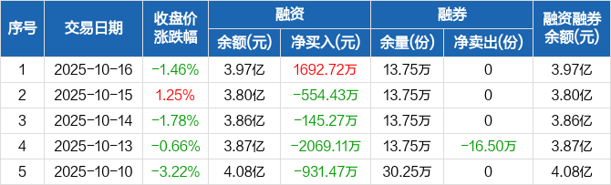融資方面,當(dāng)日融資買入5155.88萬元,融資償還3463.16萬元,融資凈買入1692.72萬元。融券方面,融券賣出0份,融券償還0份,融券余量13.75萬份,融券余額12.09萬元。融資融券余額合計3.97億元。